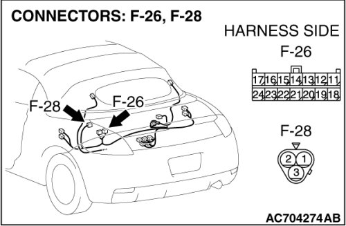 STEP 4. Check the harness between convertible top control module connector F-26 (terminal 16) and Tonneau latch switch connector F-28 (terminal 1) or the harness between convertible top control module connector F-26 (terminal 18) and Tonneau latch switch connector F-28 (terminal 1).