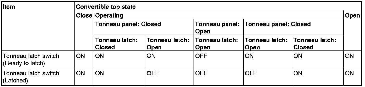 - The tonneau latch switch is the one of those switches and it consists of a tonneau latch switch (Ready to latch) detecting the tonneau panel state and a tonneau latch switch (Latched) detecting the tonneau latch state. Signals from the tonneau latch switch (Ready to latch) and the tonneau latch switch (Latched) are input through different circuits to the convertible top control module, and the following signals are output to the convertible top control module according to the opening state of the convertible top.