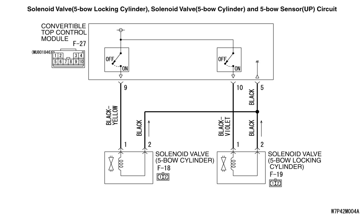 YES Check the harness between convertible top control module connector F-27 (terminal 5, 10) and solenoid valve (5-bow locking cylinder) connector F-19 (terminal 2, 1). Repair as necessary.