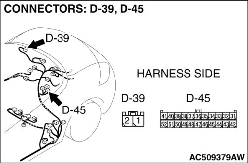 STEP 3. Check convertible top control module connector D-45 for loose, corroded or damaged terminals, or terminals pushed back in the connector.