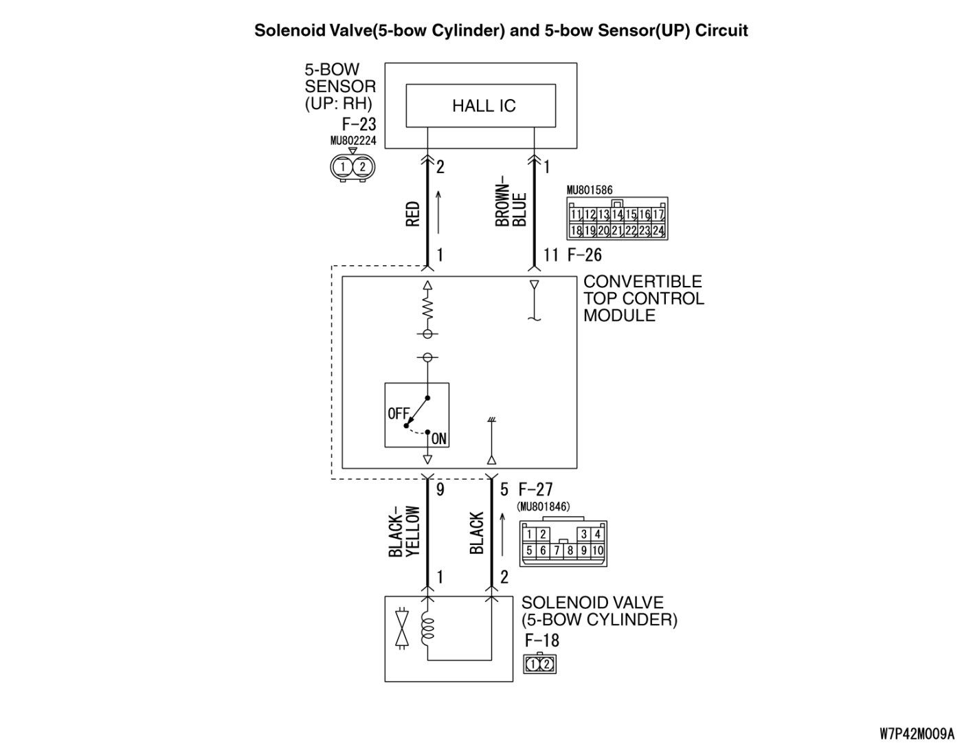 YES Check the harness between convertible top control module connector F-27 (terminal 5, 9) and solenoid valve (5-bow cylinder) connector F-18 (terminal 2, 1). Repair as necessary.