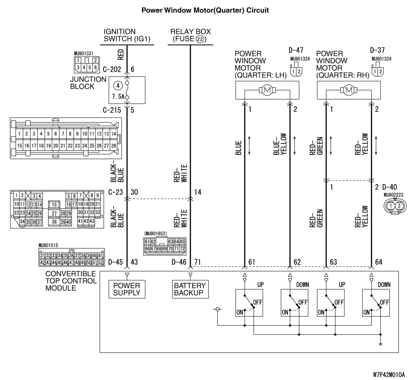 At convertible top operation, the convertible top control module applies current to the power window motor (quarter) to lower the quarter window glass. When it detects the motor lock current from the power window motor (quarter), it determines that the quarter window glass is lowered to the end, and then stops this control.