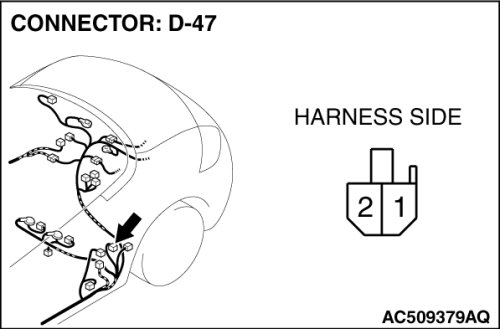 STEP 2. Check power window motor (quarter: LH) connector D-47 for loose, corroded or damaged terminals, or terminals pushed back in the connector.