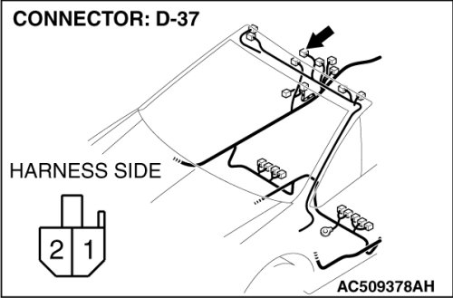 STEP 6. Check power window motor (quarter: RH) connector D-37 for loose, corroded or damaged terminals, or terminals pushed back in the connector.
