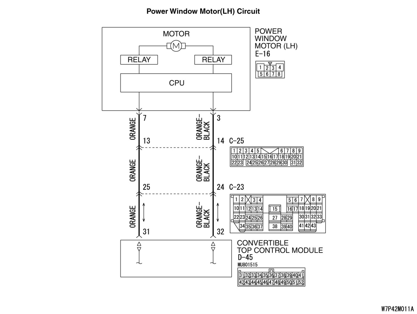 STEP 3. Check the harness between power window motor (LH) connector E-16 (terminal 7, 3) and convertible top control module connector D-45 (terminal 31, 32).