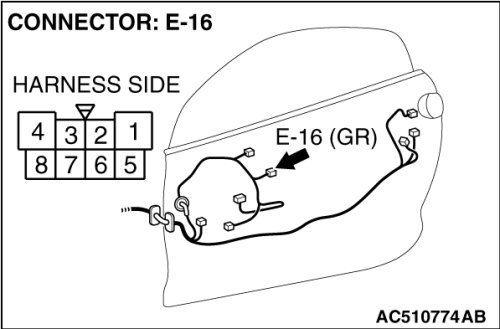 STEP 2. Check convertible top control module connector D-45 and power window motor (LH) connector E-16 for loose, corroded or damaged terminals, or terminals pushed back in the connector.