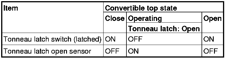 The convertible top control module judges the tonneau latch state based on the signals from the tonneau latch switches (latched) and the tonneau latch open sensor provided on the tonneau latch cylinder. The tonneau latch open sensor and tonneau latch switch (latched) output the following signals to the convertible top control module according to the tonneau latch state.