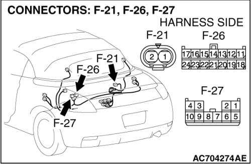 STEP 3. Check convertible top control module connector F-26, F-27 and tonneau latch open sensor connector F-21 for loose, corroded or damaged terminals, or terminals pushed back in the connector.