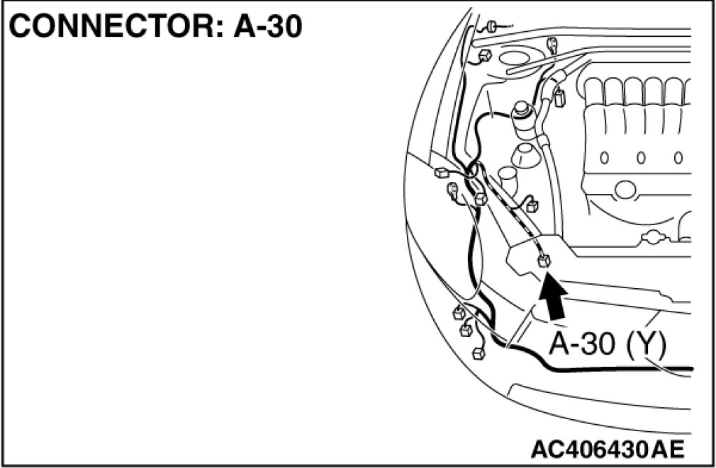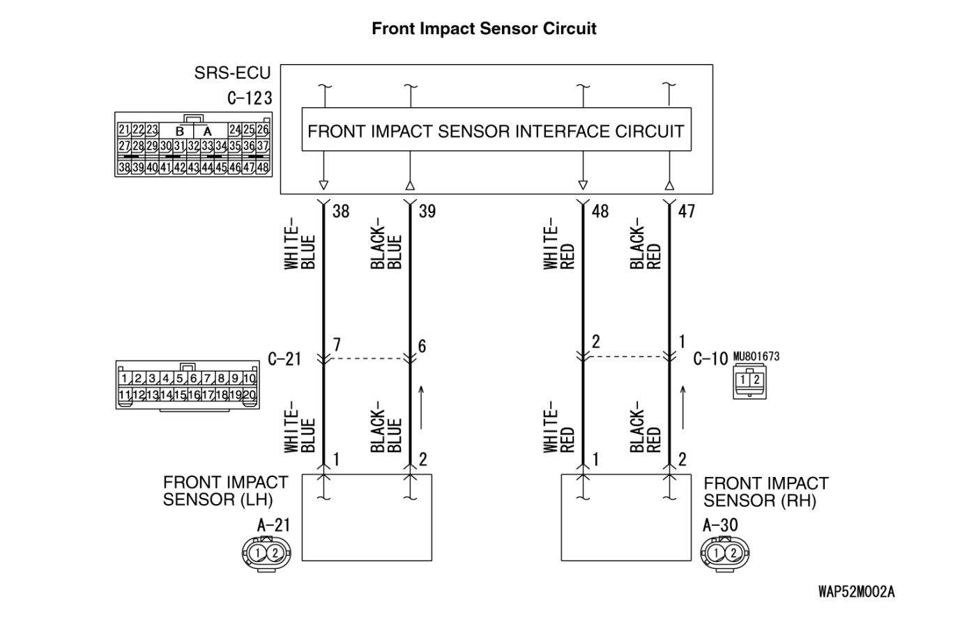 STEP 4. Check the harness wires for open circuit or short circuit between SRS-ECU connector C-123 (terminal No.47 and 48) and front impact sensor (RH) connector A-30 (terminal No.2 and 1).