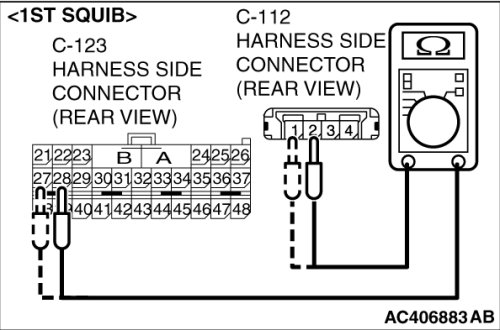 Insert special tool MB991866 into the harness side connector C-112 (terminal No.1 and 2 [1st squib] or terminal No.3 and 4 [2nd squib]) by backprobing.