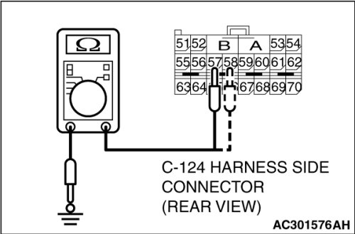 Check for continuity between C-124 harness side connector terminals 57, 58 and body ground.