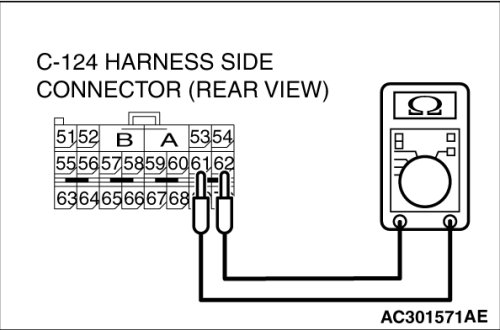 Check for continuity between C-124 harness side connector terminals 61 and 62.