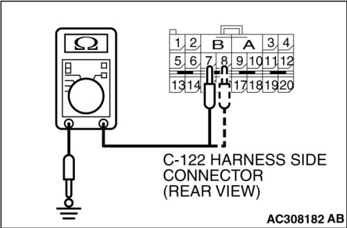 Check for continuity between C-122 harness side connector terminals 7, 8 and body ground.