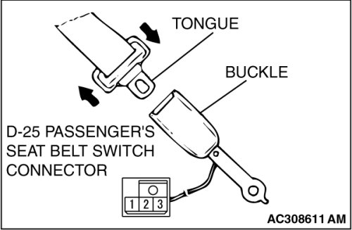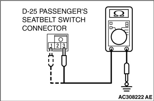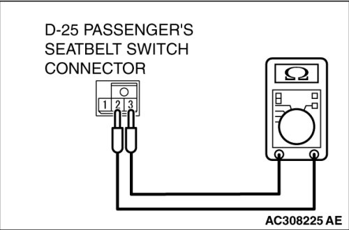 - Check continuity between the passenger's seat belt switch connector D-25 terminals.