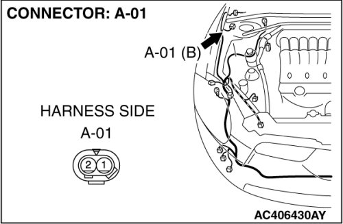 (1)Disconnect the connector A-38, and connect special tool MB991997 to the wiring harness-side connector.