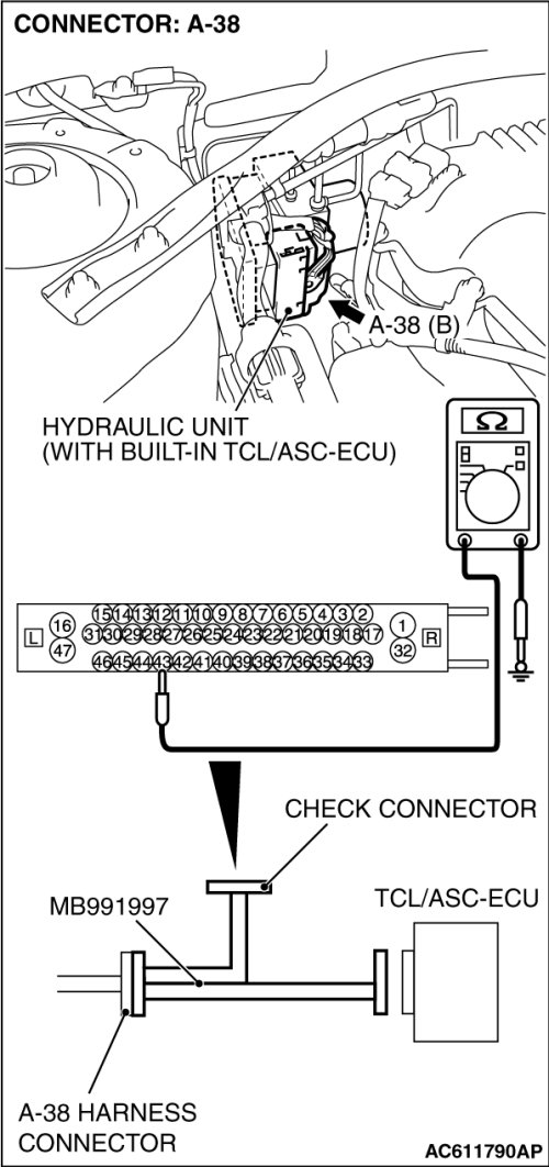 STEP 9. Measure the resistance at TCL/ASC-ECU connector A-38.