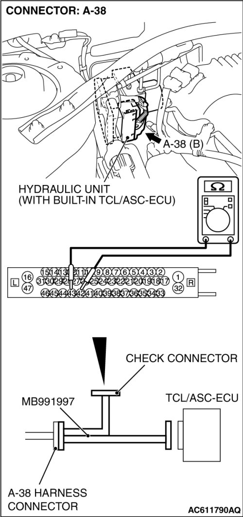 (1)Disconnect the connector A-38, and connect special tool MB991997 to the wiring harness-side connector.