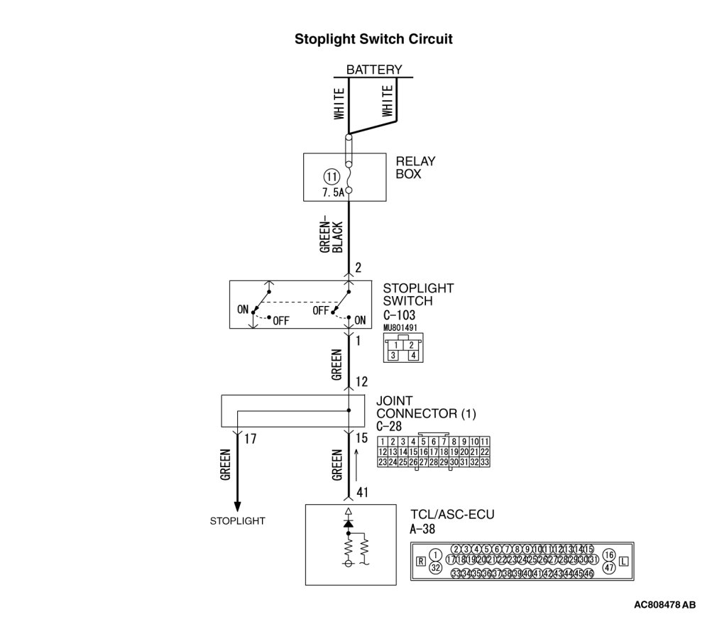- The "ON" signal when the brake pedal is pressed or the "OFF" signal when the brake pedal is released is input to the TCL/ASC-ECU (terminal 41).