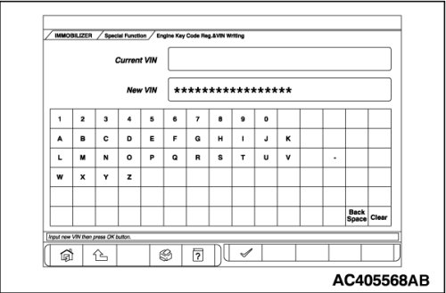 The Vehicle Identification Number (VIN) is stored in the ECM or PCM by the vehicle manufacture. If the VIN to be stored in the ECM or PCM is eliminated fraudulently, the Malfunction Indicator Lamp (SERVICE ENGINE SOON or Check Engine Lamp) illuminates and Diagnostic Trouble Code (DTC) No.P0630 (VIN malfunction) is shown. When the ECM or PCM is replaced, and entry of the VIN necessary due to DTC No. P0630 (VIN malfunction). Enter the VIN in accordance with the procedure as follows: