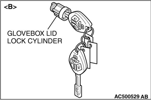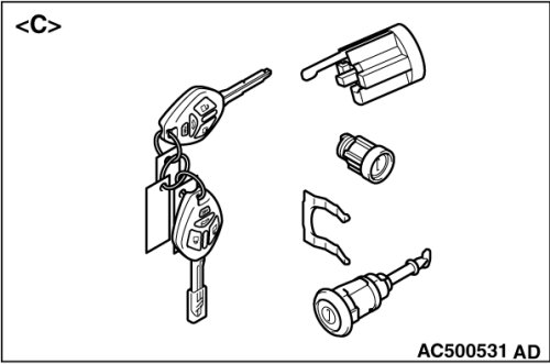 - Do not register the ignition keys other than the ignition key that starts the engine. (When replacing by the door lock key cylinder of illustration[ A] or the glove box lid lock cylinder of illustration[ B], the engine cannot start if the encrypted code is registered with the bar code on the ignition key supplied simultaneously. If the ignition key using for each lock cylinder and starting engine is used as a common ignition key, replace by the key set of illustration[ C].)