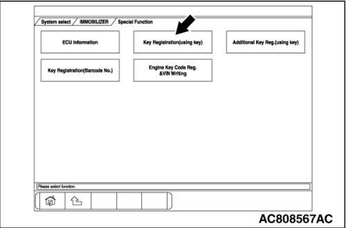 ENCRYPTED CODE REGISTRATION USING IGNITION KEY [REGISTRATION USING SCAN TOOL MB991958 (M.U.T.-III SUB ASSEMBLY)]