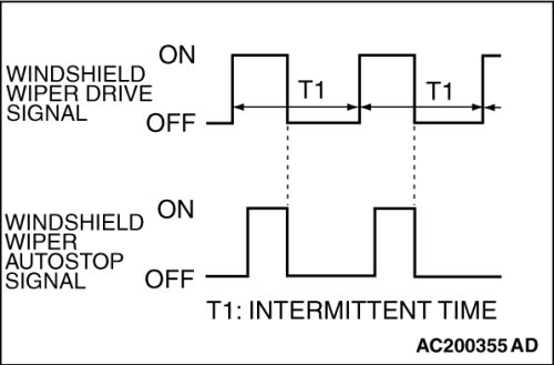 The front-ECU determines the intermittent time T1 from the input SWS data signal, and turns ON the windshield wiper drive signal. When the wiper is at the STOP position, the windshield wiper auto-stop signal goes OFF then turn OFF the windshield wiper drive signal. After the intermittent time T1 seconds from when the windshield wiper drive signal turned ON, the windshield wiper drive signal is turned ON again and the above operation is repeated.