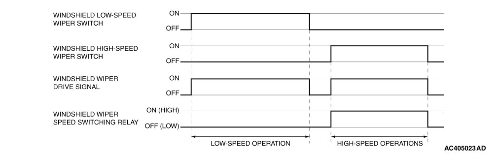 When the ignition switch in at the ACC or ON position, and the windshield low-speed wiper switch of the column switch is turned ON, the front-ECU turns ON the windshield wiper drive signal, turns OFF (LOW) the windshield wiper speed relay, and operates the windshield wiper at low-speed. Next, when the windshield high speed wiper switch is turned ON, the windshield wiper drive signal is turned ON, the windshield wiper speed switching relay is turned ON (HIGH), and the windshield wiper is operated at high-speed.
