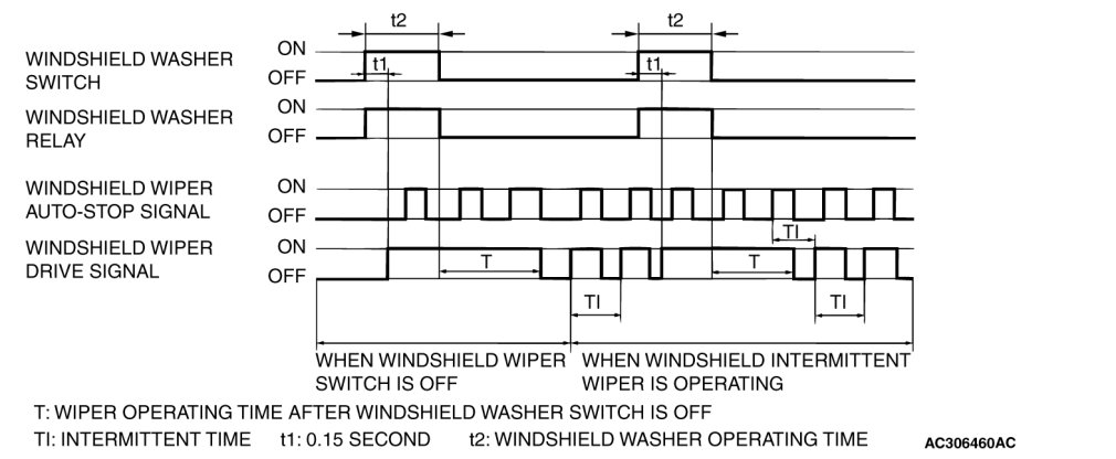 At the point the windshield mist switch is turned ON, if the windshield wiper has been operating intermittently, the same operations as the above will be performed while the windshield mist wiper switch is ON. After the windshield mist wiper switch goes OFF, the intermittent operations will be set again T1 seconds after the last windshield wiper auto-stop signal turning ON.