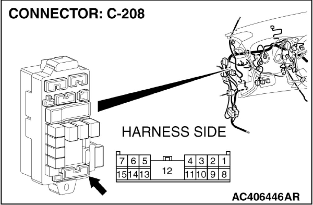 Also check junction block connector C-208 for loose, corroded, or damaged terminals, or terminals pushed back in the connector. If junction block connector C-208 is damaged, repair or replace the damaged component(s) as described in Harness Connector Inspection Harness Connector Inspection.