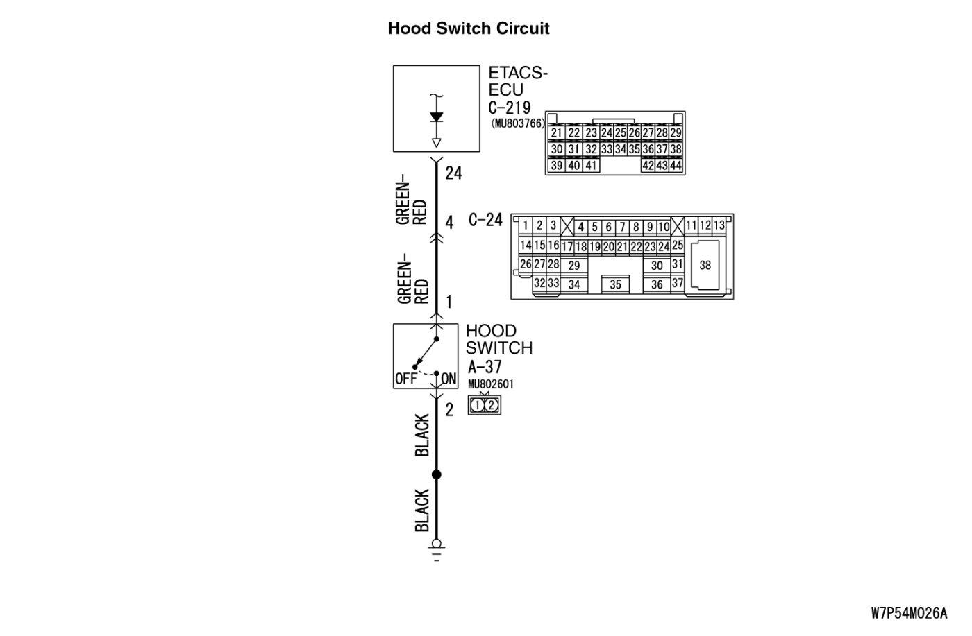 STEP 6. Check the wiring harness between hood switch connector A-37 (terminal 1) and ETACS-ECU connector C-219 (terminal 24).