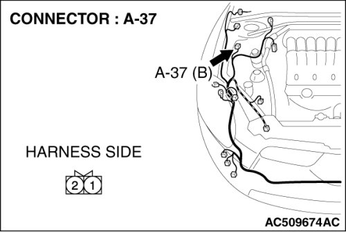 (1)Disconnect hood switch connector A-37 and measure the resistance available at the wiring harness side of the connector.