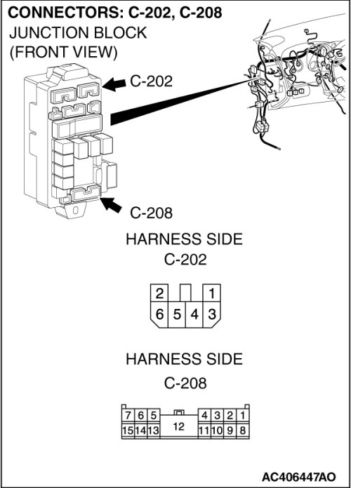 Also check intermediate connector F-02, junction block connectors C-202 and C-208 for loose, corroded, or damaged terminals, or terminals pushed back in the connector. If intermediate connector F-02, junction block connectors C-202 or C-208 are damaged, Repair or replace the damaged component(s) as described in Harness Connector Inspection Harness Connector Inspection.