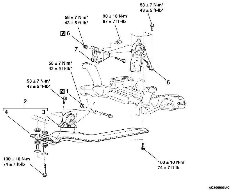 *: Indicates parts which should be initially tightened, and then fully tightened after placing the vehicle horizontally and loading the full weight of the engine on the vehicle body.