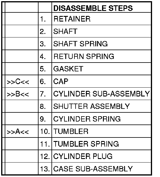 2. From the key code select the proper tumbler combinations required to make a functional lock, reference key biting and tumbler placement chart (refer to table 1).