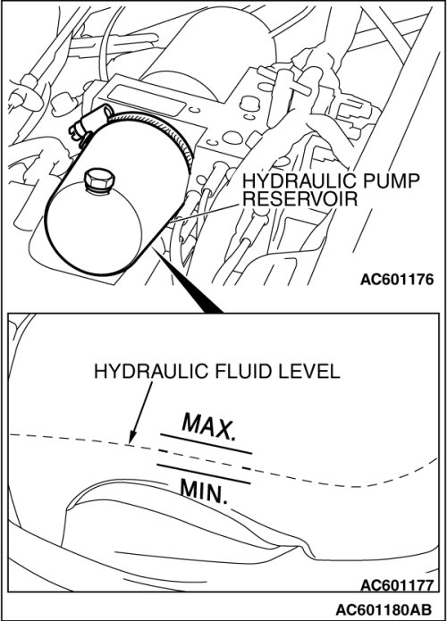 (2) Check the hydraulic fluid level in the hydraulic pump reservoir. The hydraulic fluid should be between the MAX and MIN marks.