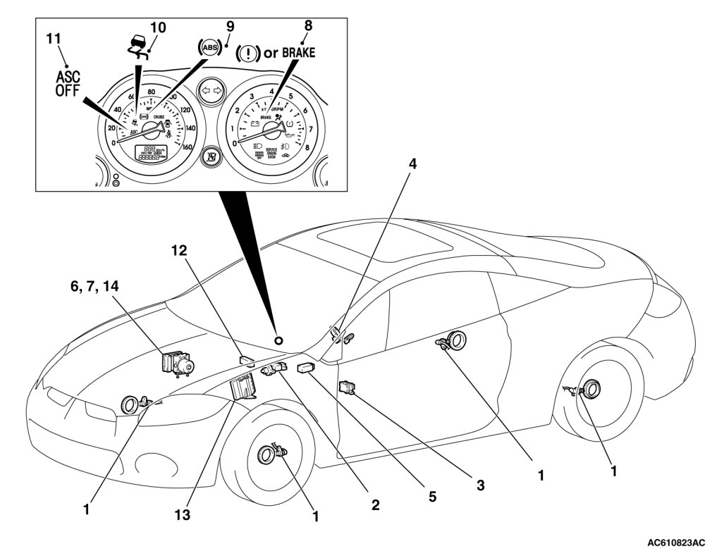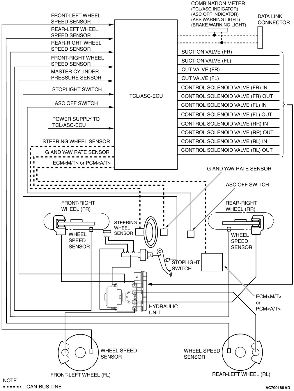 The TCL/ASC is a system that adds a yaw rate sensor, a lateral G sensor, a steering wheel sensor and master cylinder pressure sensor (incorporated in hydraulic unit) to the ABS system.