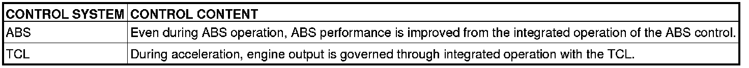 The TCL prevents drive force loss during slipping of the drive wheels by automatically applying the brakes and sending engine torque reduction signal to the ECM [M/T] or PCM [A/T] when the drive wheels slip or when driving on partly low-friction surfaces.