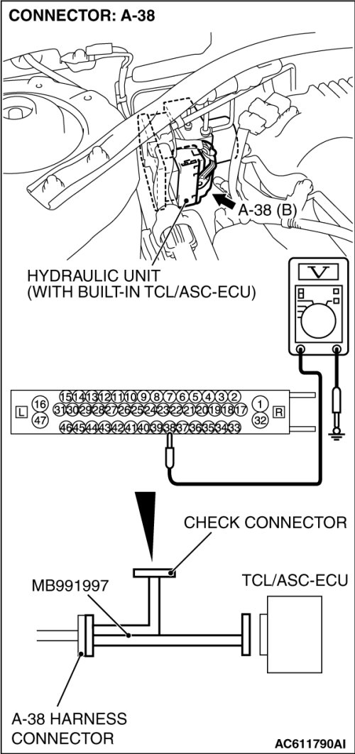 (2)Connect special tool MB991997 between the TCL/ASC-ECU and the body-side harness connector A-38.