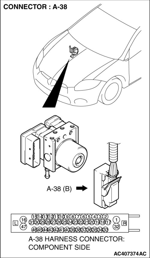 2. Disconnect the TCL/ASC-ECU connector A-38, and then use special tool MB991997 to measure the output voltage at the harness side connector.