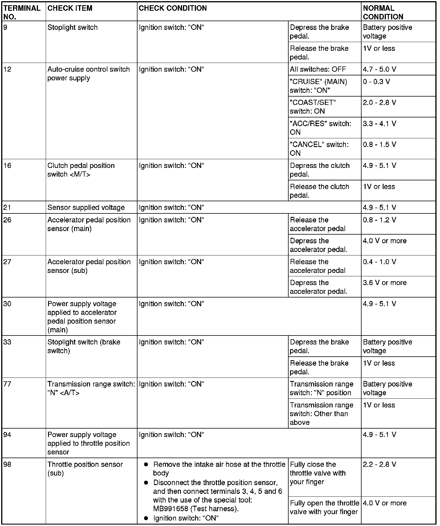 ]]ECM [M/T] OR PCM [A/T] TERMINAL VOLTAGE REFERENCE CHART FOR AUTO-CRUISE CONTROL SYSTEM OPERATION
