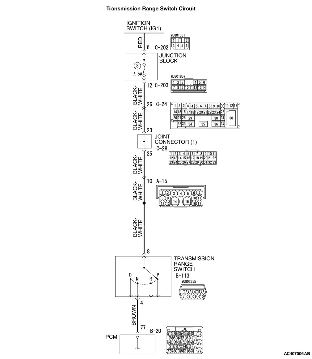 - Battery positive voltage is applied to the PCM terminal 77 when the selector lever is in the "N" range. The PCM judges that the selector lever is in the "N" range when the battery positive voltage is applied.