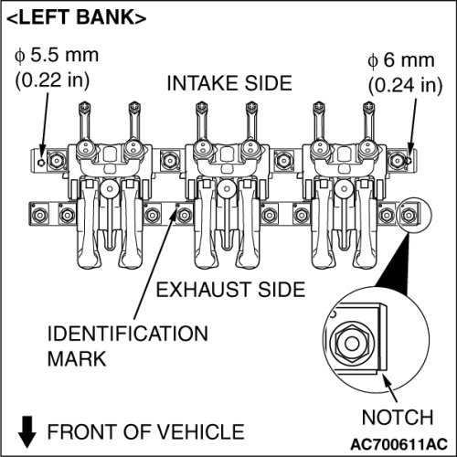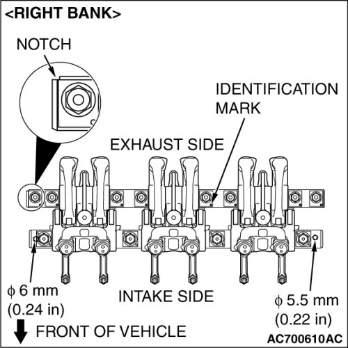 1. Install the intake side rocker arm and shaft assembly so that the dia.6 mm (0.24inch) and dia.5.5 mm (0.22 inch) holes of rocker arm shaft face the cylinder head side.
