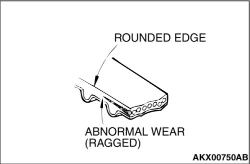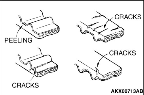 6. Abnormal wear of belt sides. Normal wear is indicated if the sides are sharp as if cut by a knife. Abnormal wear is indicated if the sides are ragged.