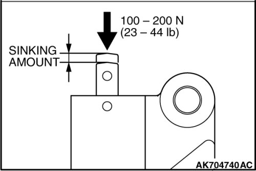 3. When the rod protrusion has approximately 5 mm (0.20 inch), apply the load of 100 - 200N (23 - 44 lb). Check whether the auto tensioner has sufficient stiffness.