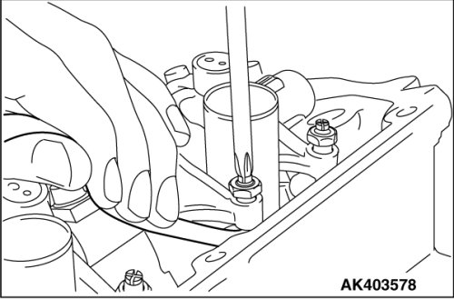 5. Slowly pressing down the rod, insert the set pin having dia.2mm (0.08 inch) through the hole to fix the auto tensioner.