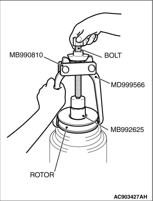 Rotor can be removed by hand, but if it is difficult to remove it, use the guide (MB992625), the side bearing puller (MB990810) and the claw (MD999566) as shown.