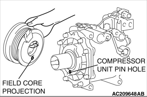 Line up the pin hole on the compressor unit with the field core projection and attach.