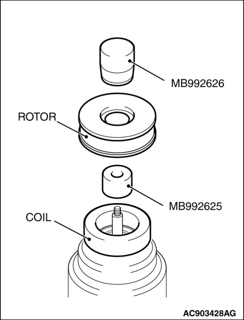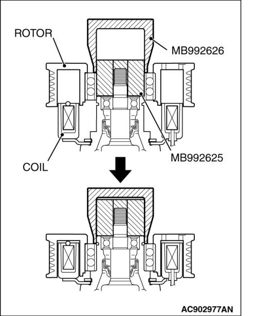 - Be sure to use the guide (MB992625) when the side bearing puller (MB990810) and claw (MD999566) are used to prevent the damage of A/C compressor.