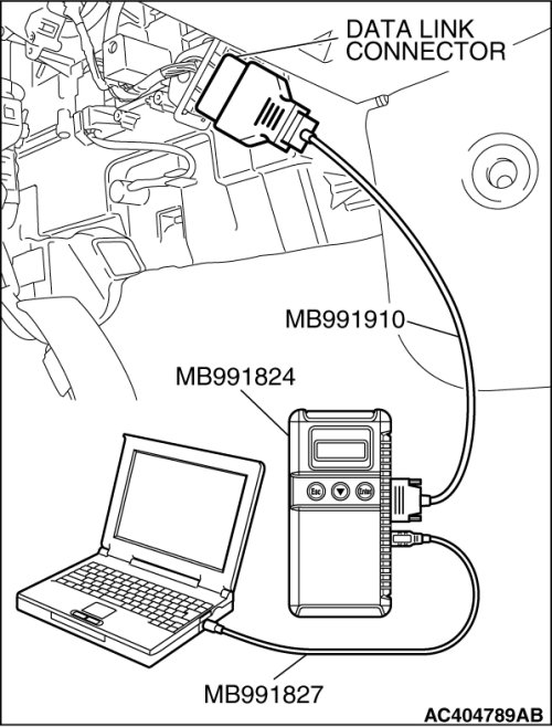 1. Connect the scan tool MB991958 to the data link connector.