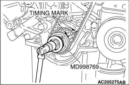 5. Use special tool MD998769 to turn the crankshaft 1/4 turn counterclockwise, then turn it again clockwise until the timing marks are aligned.